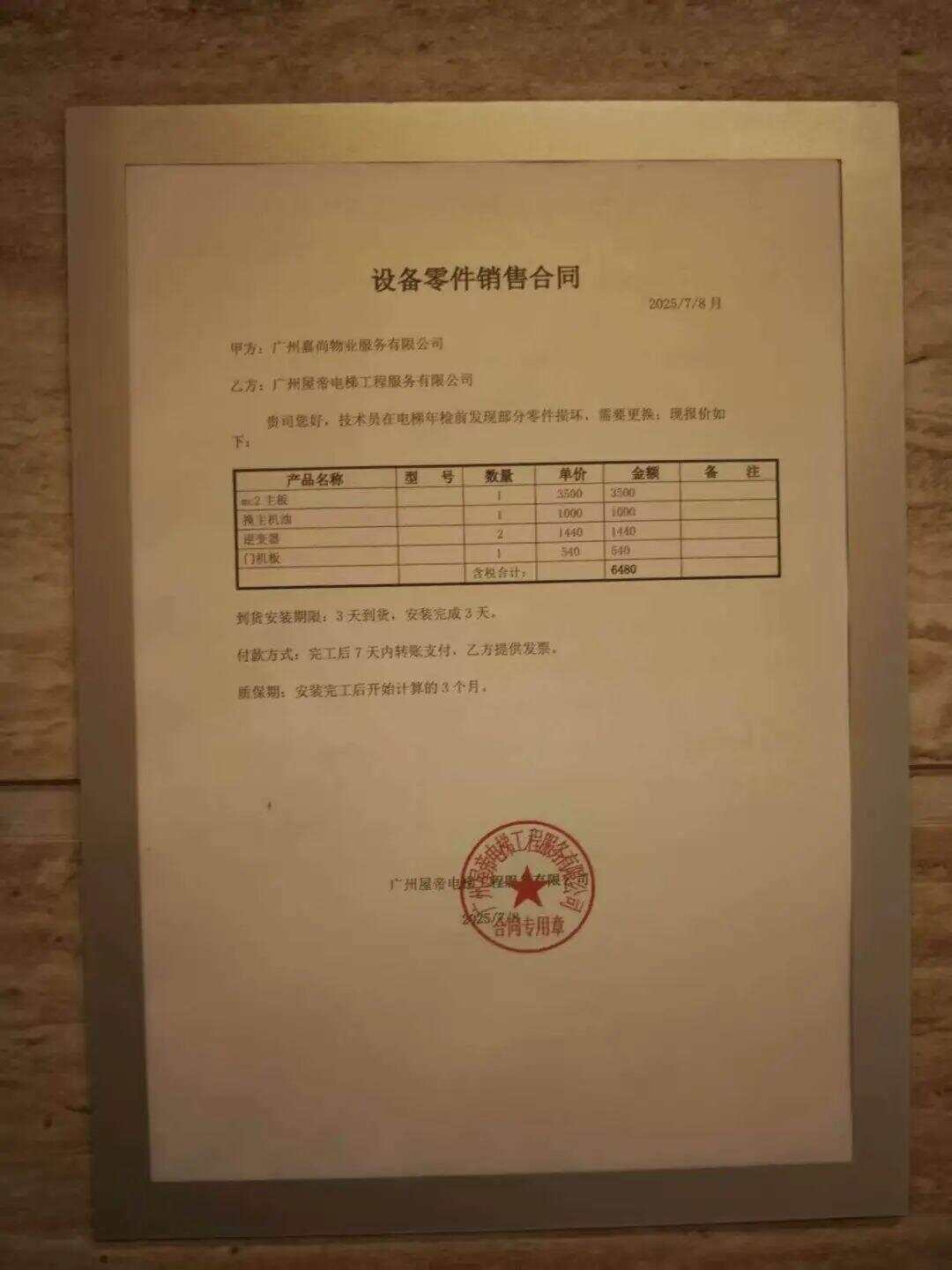 在电梯内部,有“电梯消毒登记表”向业主公开,但电梯的维保记录并未公示。在一楼大厅的公示处,“记者帮”看到了一份《大修报价合同》和两份《设备零件销售合同》,合同甲方为广州嘉尚物业服务有限公司,乙方为广州屋帝电梯工程服务有限公司,合同内容为电梯部件老化,需要更换,涉及部件包括变频器、底主板、逆变器、门机板等。